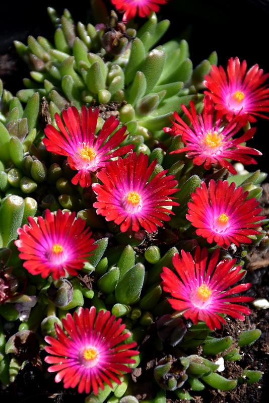 A low growing carpet-like, succulent, native to South Africa but amazingly hardy in North America; dazzling red daisy-like flowers with hot pink rings and gold centers; perfect for xeriscapes, rock gardens, screes and sandy soils