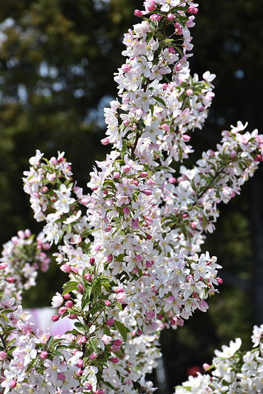 A top choice small ornamental tree for the home landscape, featuring white flowers which emerge from pink buds in spring and colorful golden fruit in fall on a dwarf upright form, good fall color too; needs well-drained soil and full sun
