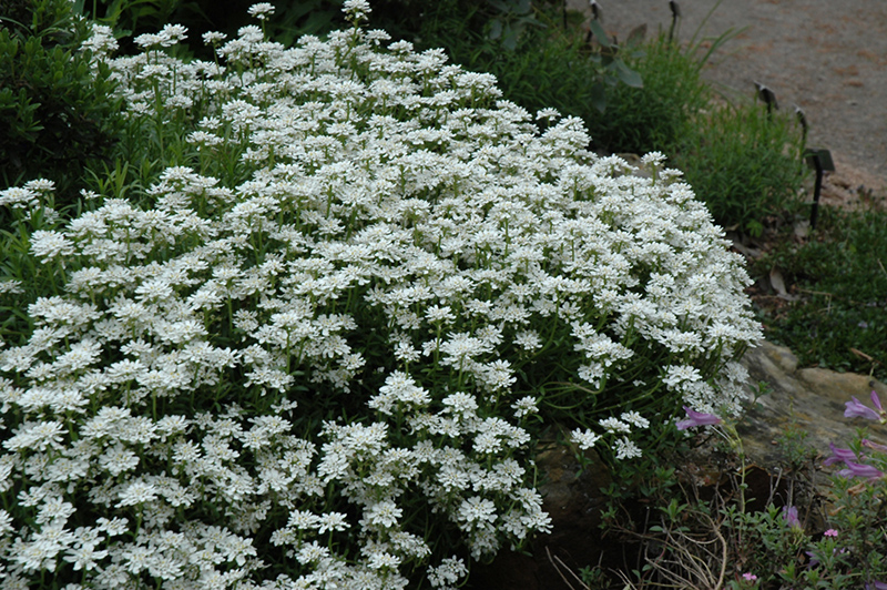 Often treated as a perennial, this is actually a low growing shrub; features a froth of snowy white flowers in spring, tidy evergreen foliage for the rest of the year; benefits from snow cover; good for general garden use
