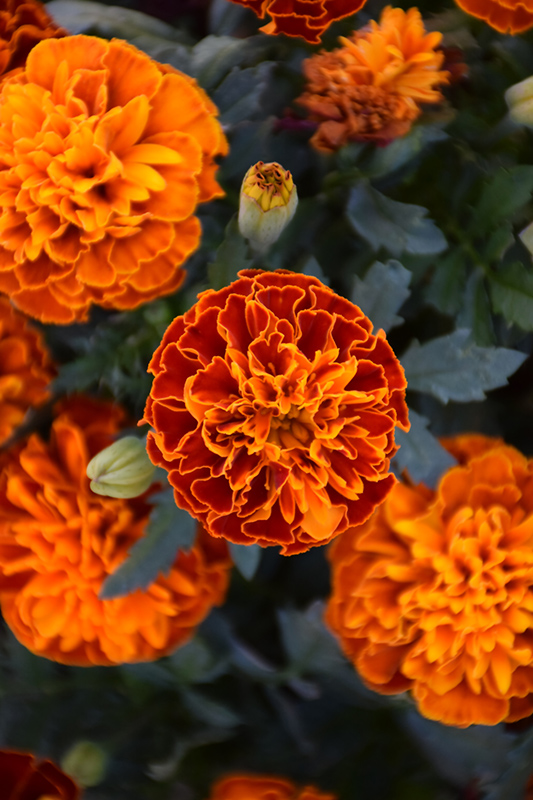 Hot Pak™ Harmony Marigold features bold double crimson pincushion flowers with gold eyes and orange edges at the ends of the stems from late spring to late summer. The flowers are excellent for cutting. Its fragrant ferny leaves remain dark green in colour throughout the season.