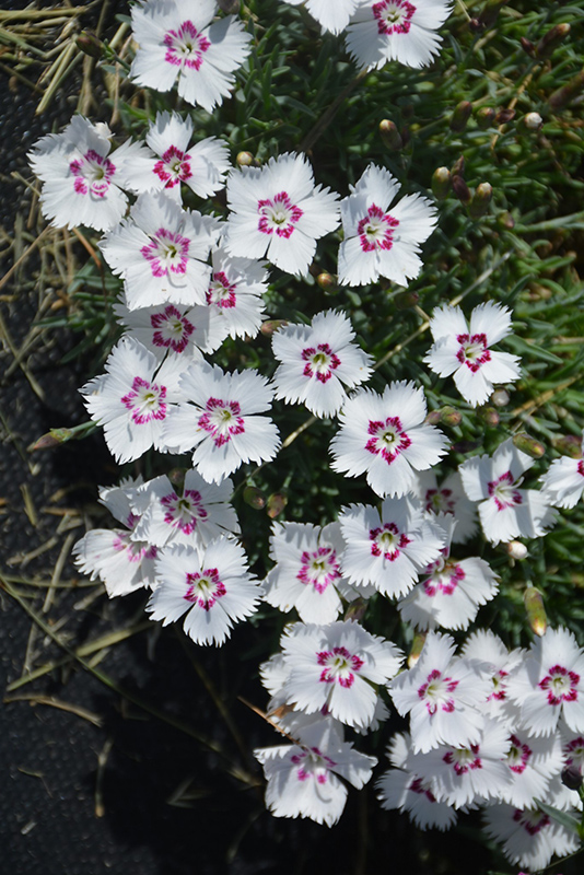 Mountain Frost™ White Twinkle Pinks is smothered in stunning fragrant white frilly flowers with a hot pink ring at the ends of the stems from mid spring to early fall. The flowers are excellent for cutting. Its attractive narrow leaves remain bluish-green in colour with hints of silvery blue throughout the year.