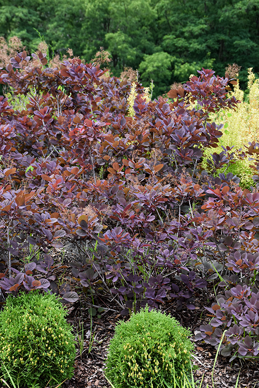 Beautiful burgundy leaves and billowy puffs of gray to pink 'smoke' cover this small, dwarf variety in summer; excellent as a small landscape accent or in patio containers; brilliant red-orange fall color