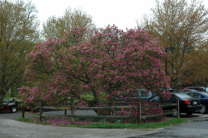 A hybrid magnolia selected for its spectacular reddish-purple cup-shaped flowers in spring before the leaves and improved hardiness; a large, mounded shrub, incredibly effective as a specimen tree in smaller home landscapes