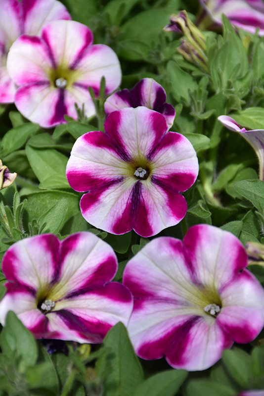Headliner™ Raspberry Swirl Petunia is bathed in stunning fuchsia trumpet-shaped flowers with yellow throats and white stripes at the ends of the stems from mid spring to early fall. Its pointy leaves remain green in colour throughout the season.