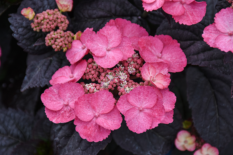 An outstanding compact shrub that features vibrant, hot pink lacecap flowers, that rebloom over silky black foliage from late spring through summer; a visually stunning choice for the flower garden or border