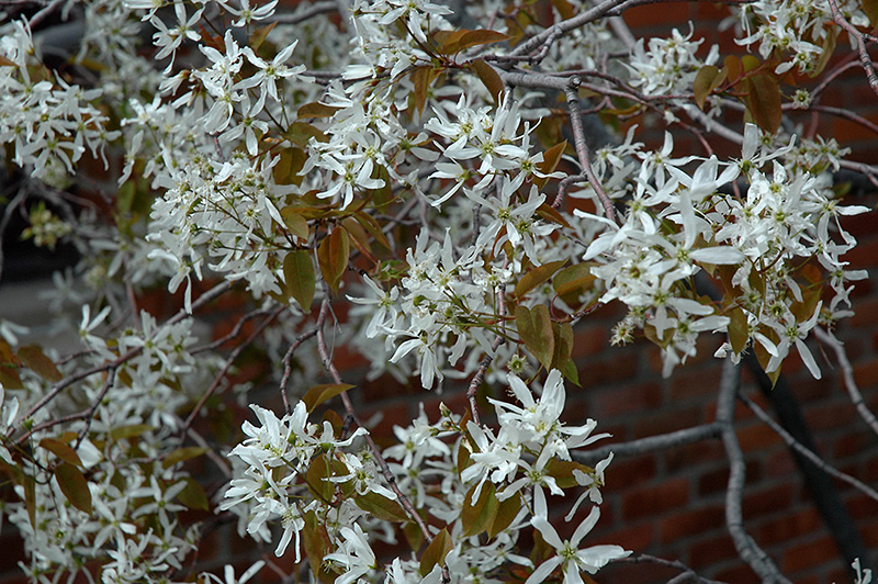 Autumn Brilliance Serviceberry is covered in stunning clusters of white flowers rising above the foliage in early spring before the leaves. It has dark green deciduous foliage. The oval leaves turn an outstanding brick red in the fall. It produces blue berries from late spring to early summer. The smooth gray bark adds an interesting dimension to the landscape.