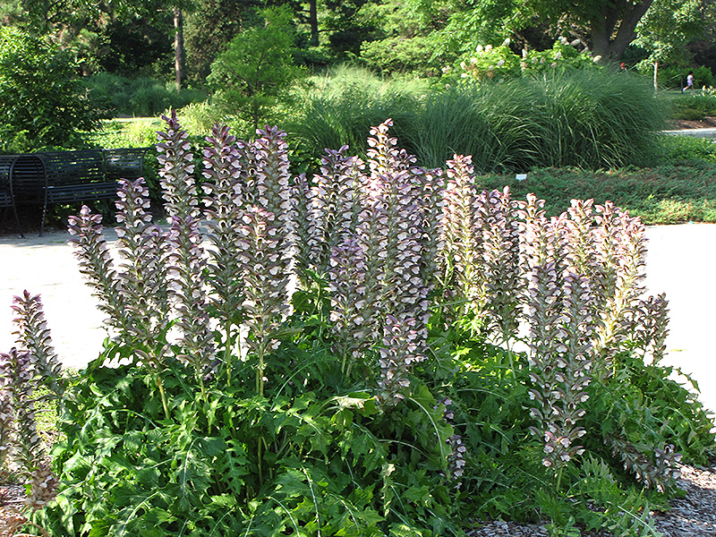 A bold specimen plant that is very popular with landscape designers; forms a clump of large mean-looking spiny leaves bearing dramatic upright spikes of hooded pink blooms; dislikes wet soil in winter; divide in spring, roots will develop into plants